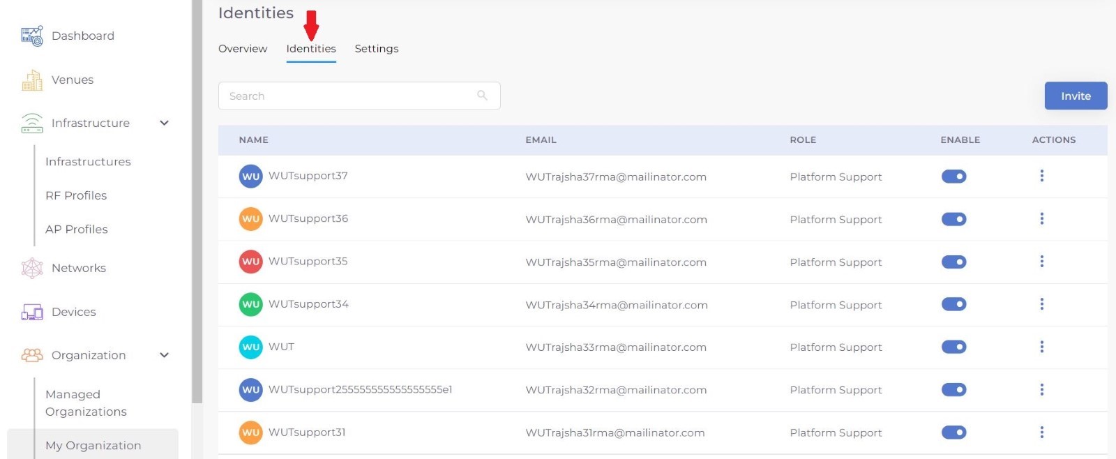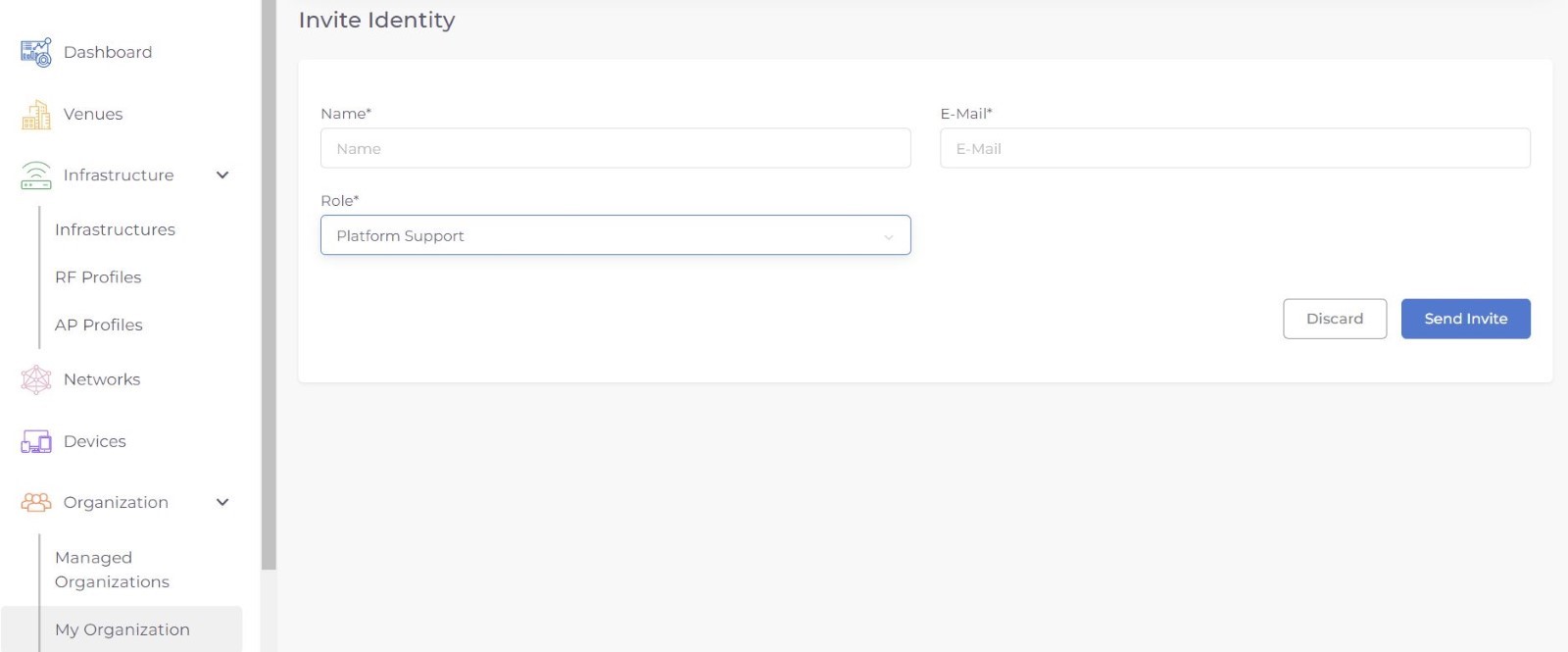 Step 2: Click on Invite button from Identities screen and enter details and select Platform-Support from dropdown.