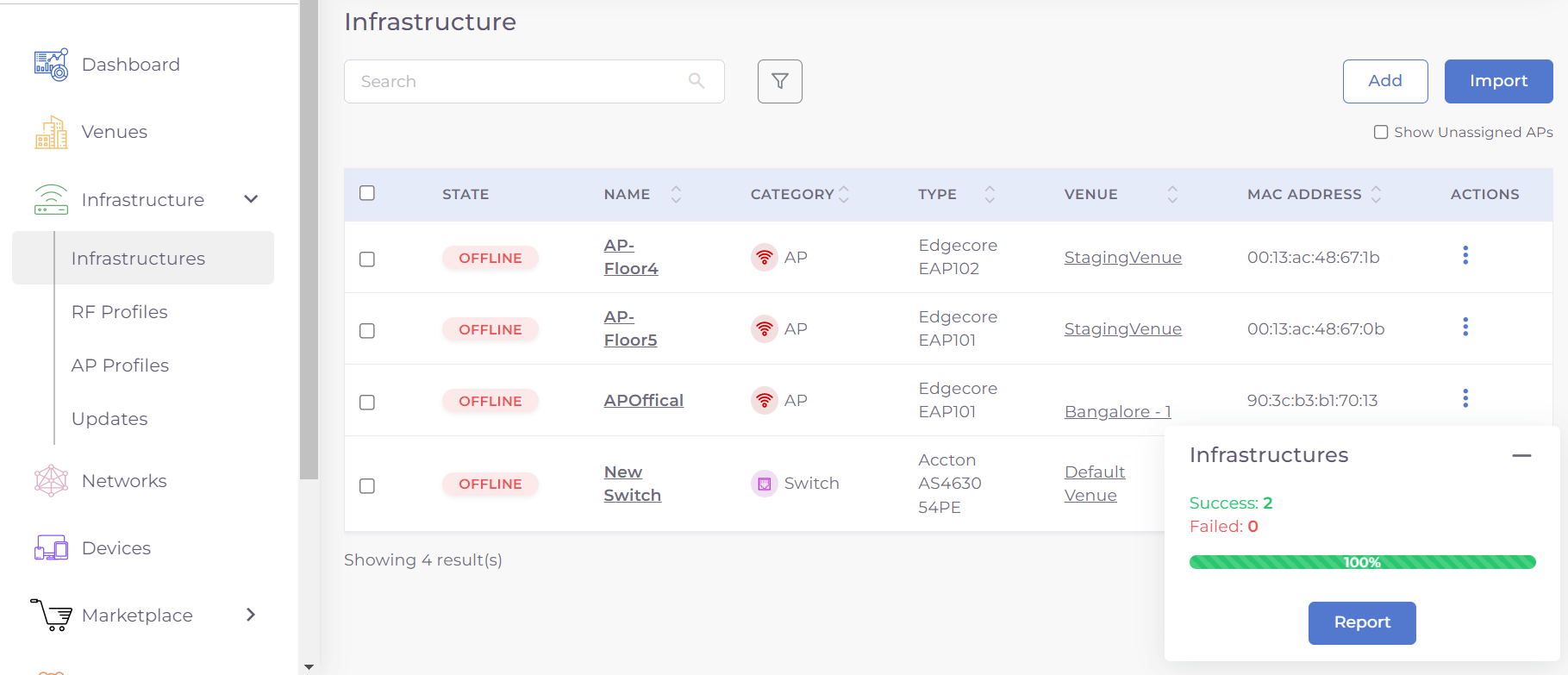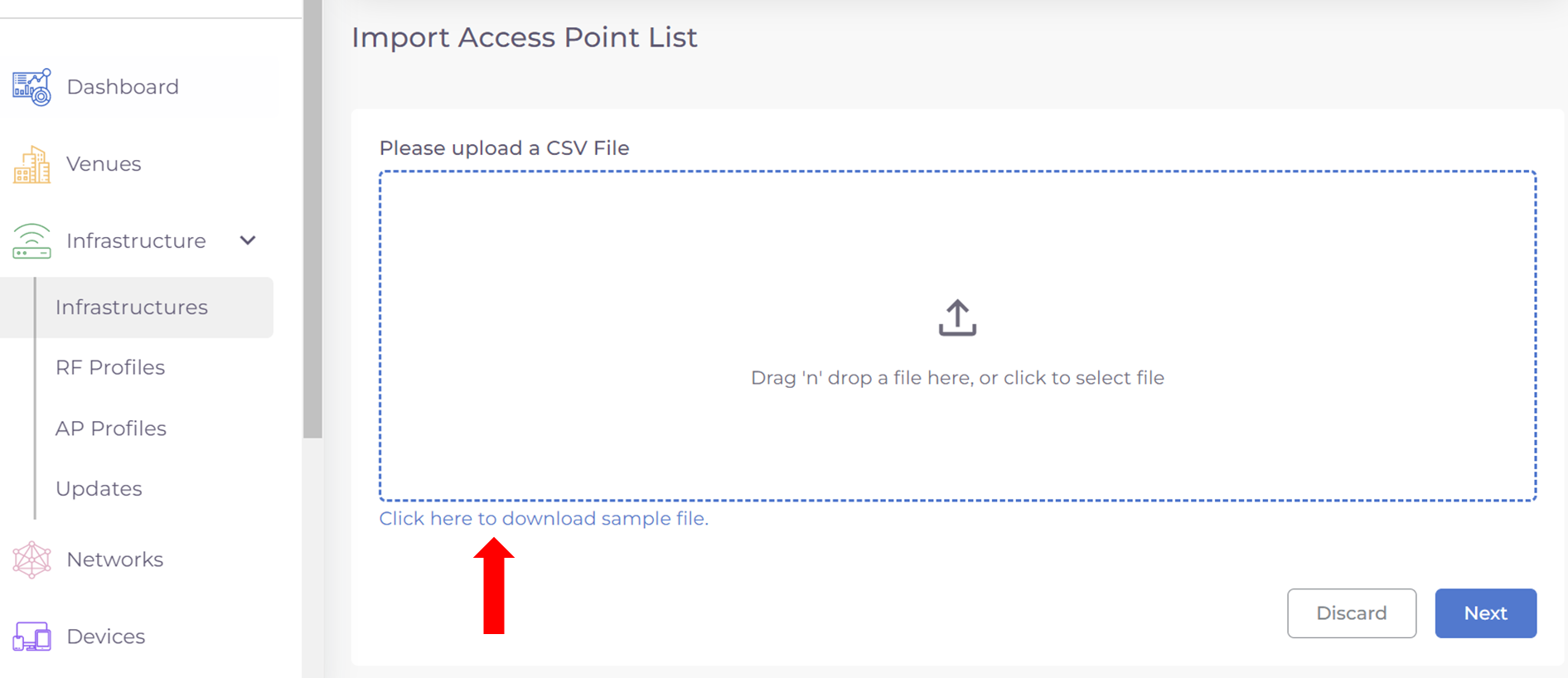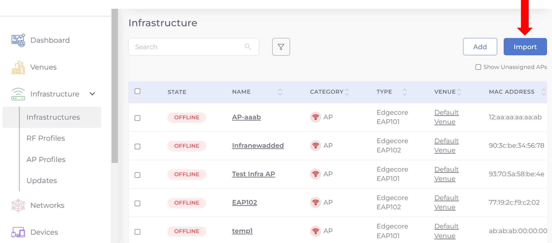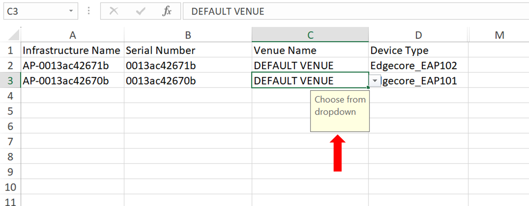 Step 4: Open the excel file, and fill in the information of Infrastructure name, Serial number, Device type and venue name in various rows. The Venue name and Device Type are dropdown fields, whose list values are auto populated as a list based on your configured venues.
