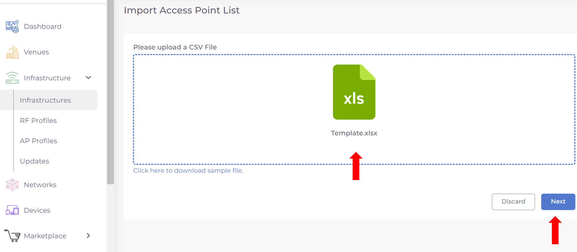 Step 3: Click the link below noted that reads "Click here to download sample file". This will download a file named Template.xlsx.