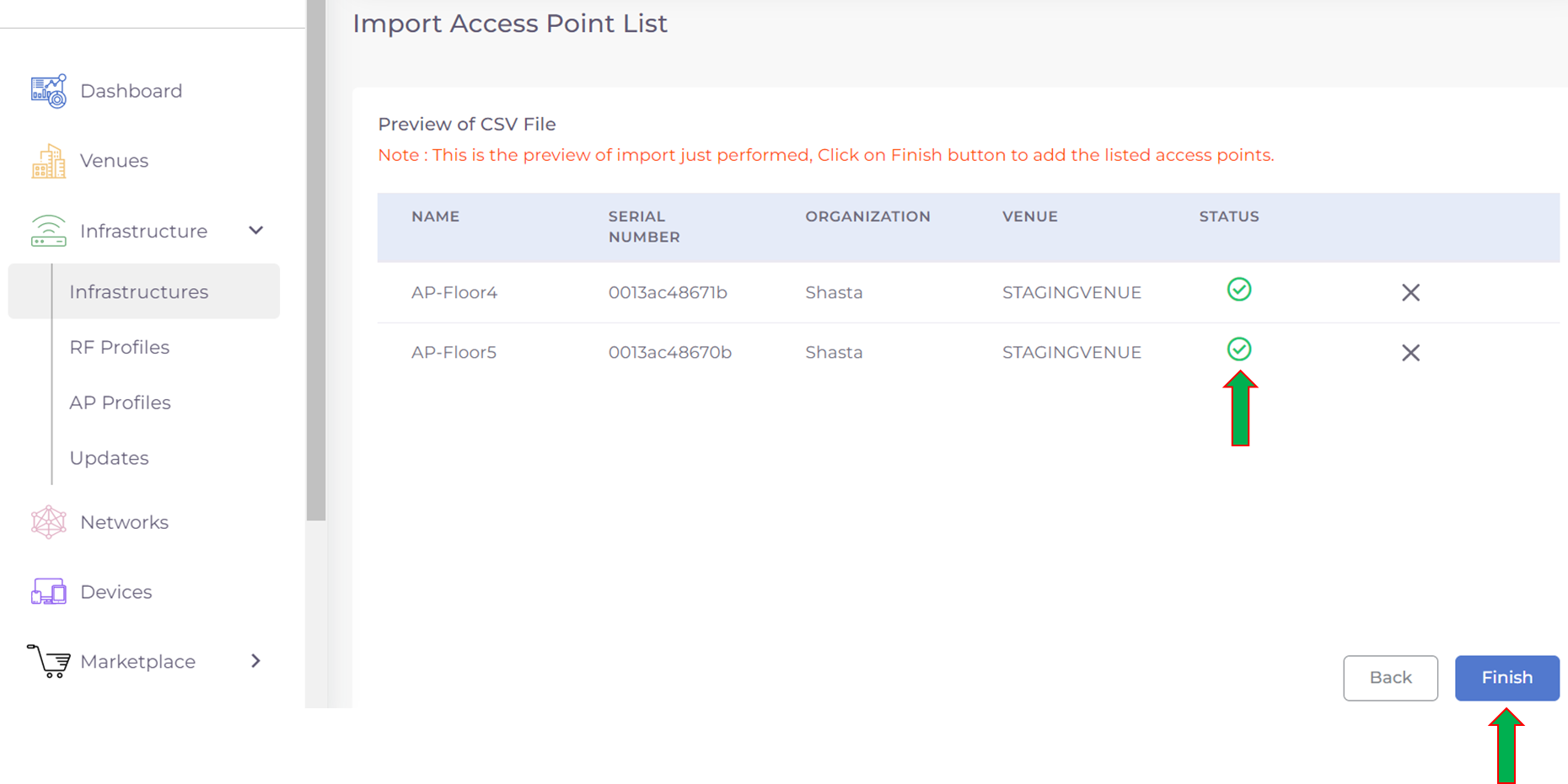 Step 6: Preview the import to make sure the Status shows Green OK indicators. Press Finish if you are confirmed to proceed bulk import.